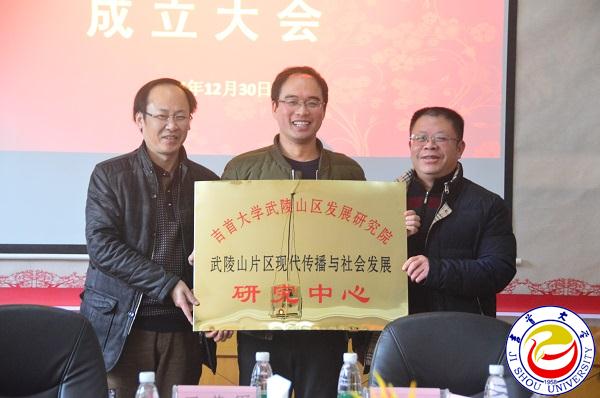武陵山区发展研究院副院长张登巧宣读了关于成立武陵山片区现代传播与社会发展研究中心的批文,并同校党委宣传部部长戴林富一同给武陵山发展片区现代传播与社会发展研究中心负责人授牌。